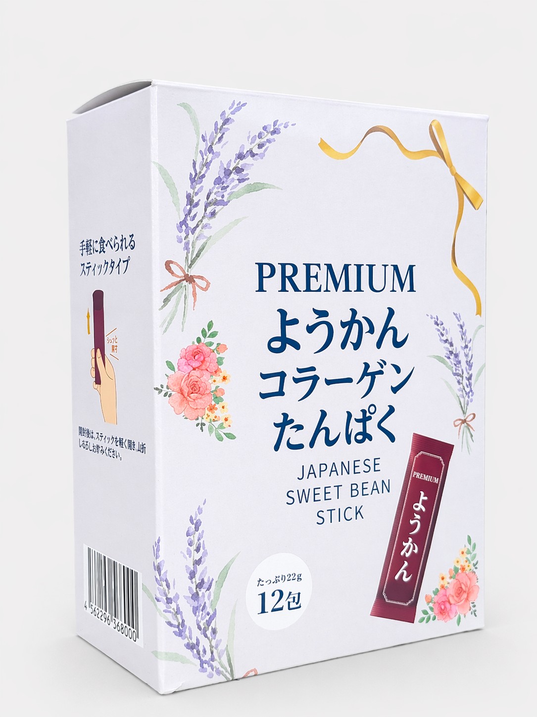 練あん(小豆,砂糖、食塩)(国内製造)、砂糖、コラーゲン末(フッシュコラーゲンペプチド、デキストリン、サトウキビ抽出物)、寒天 / 香料、 (一部にゼラチンを含む)