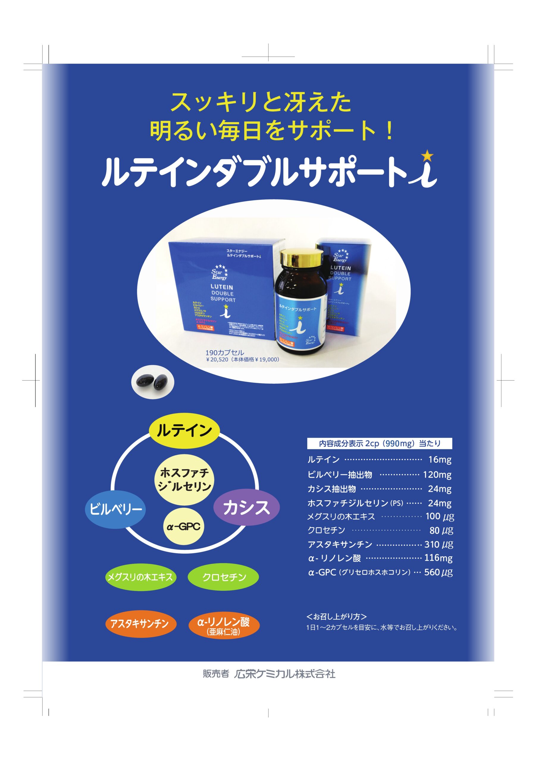 Wカロテノイド(ルテイン・アスタキサンチン)とWポリフェノール(カシス・ビルベリー)の 可能性を最大限に追求しました。さらに、ひらめき成分α-GPC、PSが、ハッキリ・クッキリした毎日をサポートします