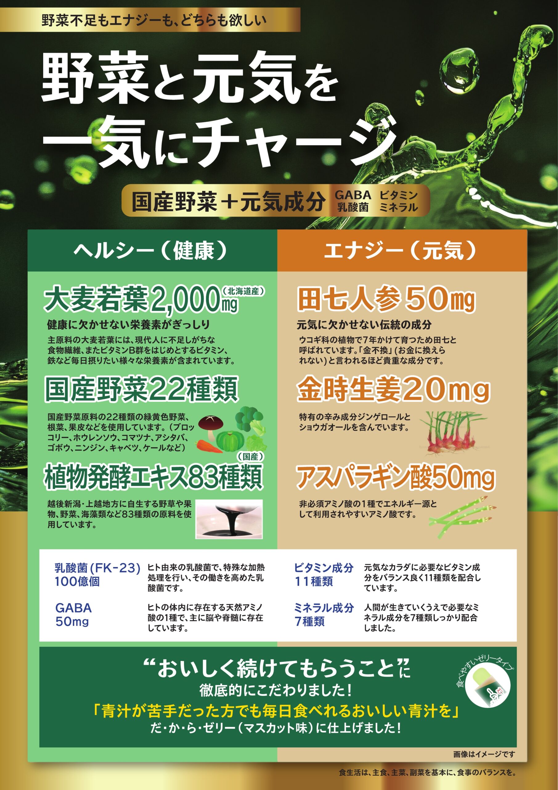 大麦若葉エキス末、国産野菜22種、植物醗酵エキス、田七人参エキス末、金時生姜、アスパラギン酸
